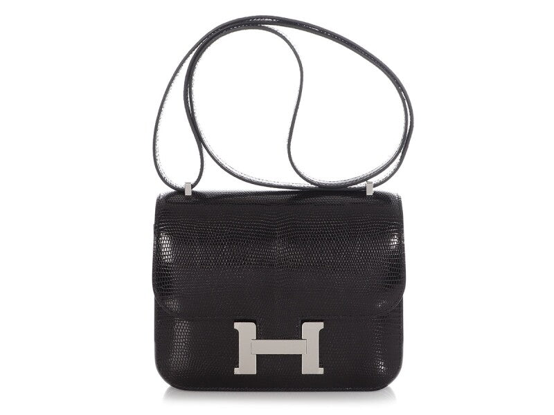 2021Description Hermes Black Shiny Niloticus Lizard Mini Constance 18 Palladium Hardware, 2021 The interior is...