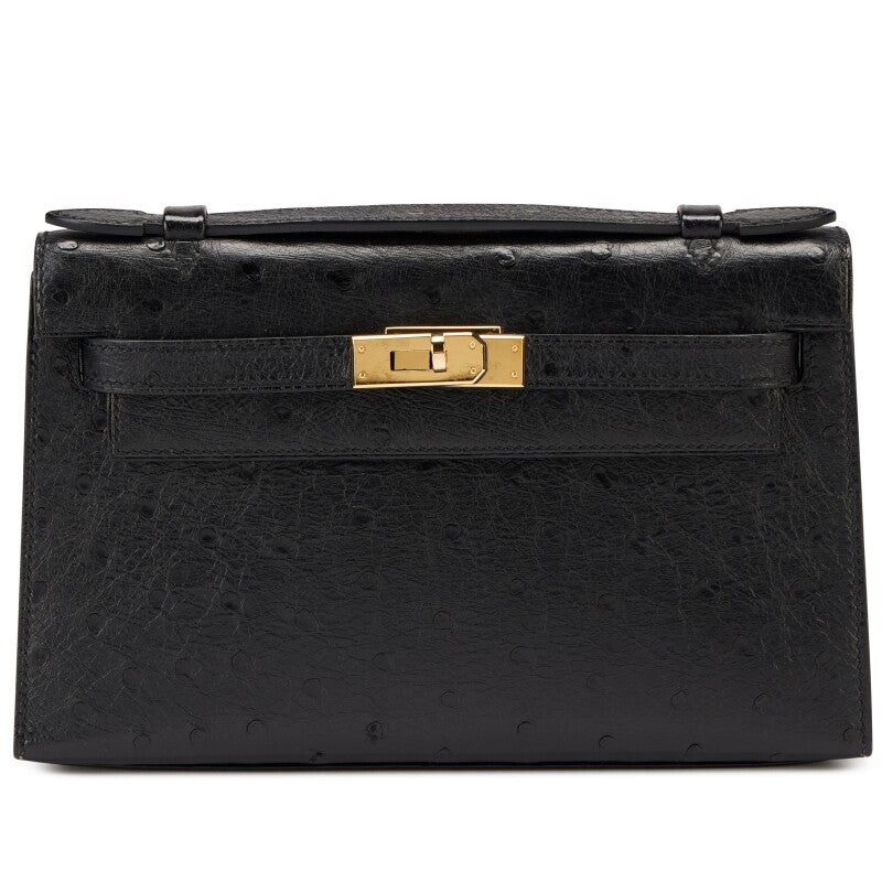 2019Description Hermes Black Ostrich Kelly Pochette Gold Hardware, 2019 Interior is lined in tonal leather...