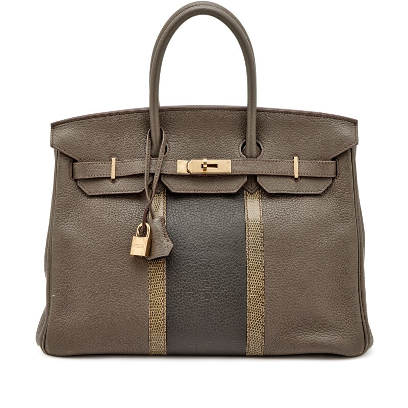 2012Description Hermes Tri-Color Etain and Graphite Clemence and Gris Fonze Lizard Club Birkin 35 Gold...
