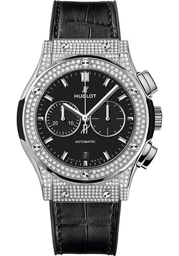 42 mm polished titanium case set with 228 diamonds totaling 1.20cts, polished titanium bezel set...