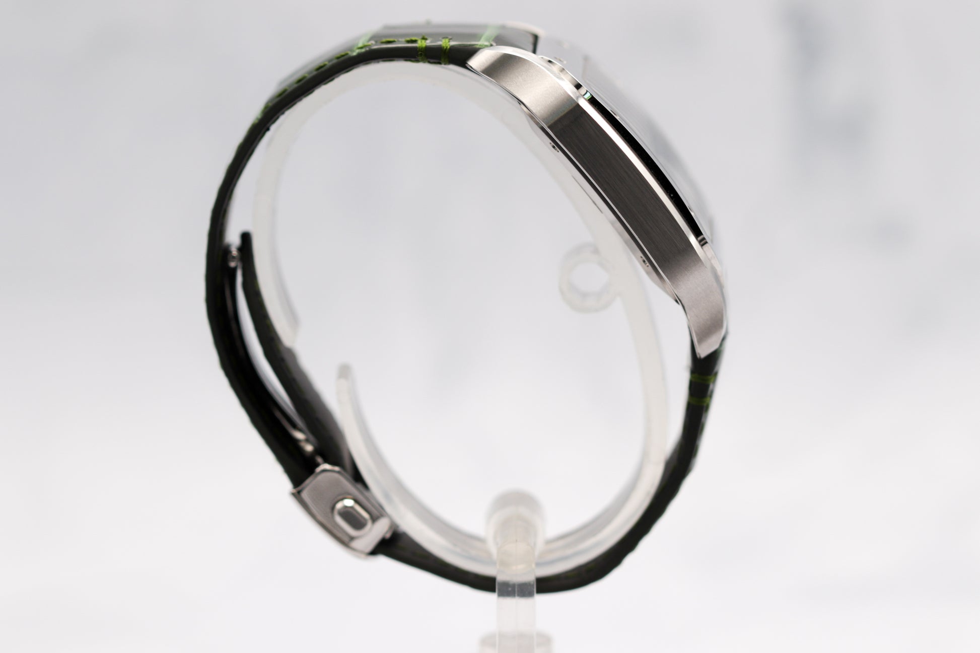 Bracelet & Strap: Stainless steel bracelet + green alligator leather strap (both included)