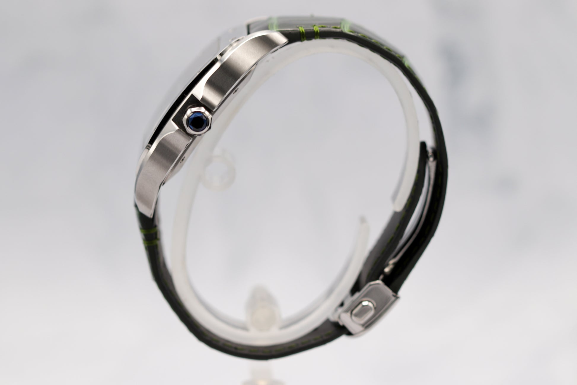 Equipped with Cartier’s innovative QuickSwitch system, this watch comes complete with both a stainless steel bracelet and a matching green alligator leather strap, allowing seamless transitions between refined and sporty looks. The automatic mechanical movement ensures precision and reliability, while the sapphire crystal offers exceptional durability and scratch resistance.