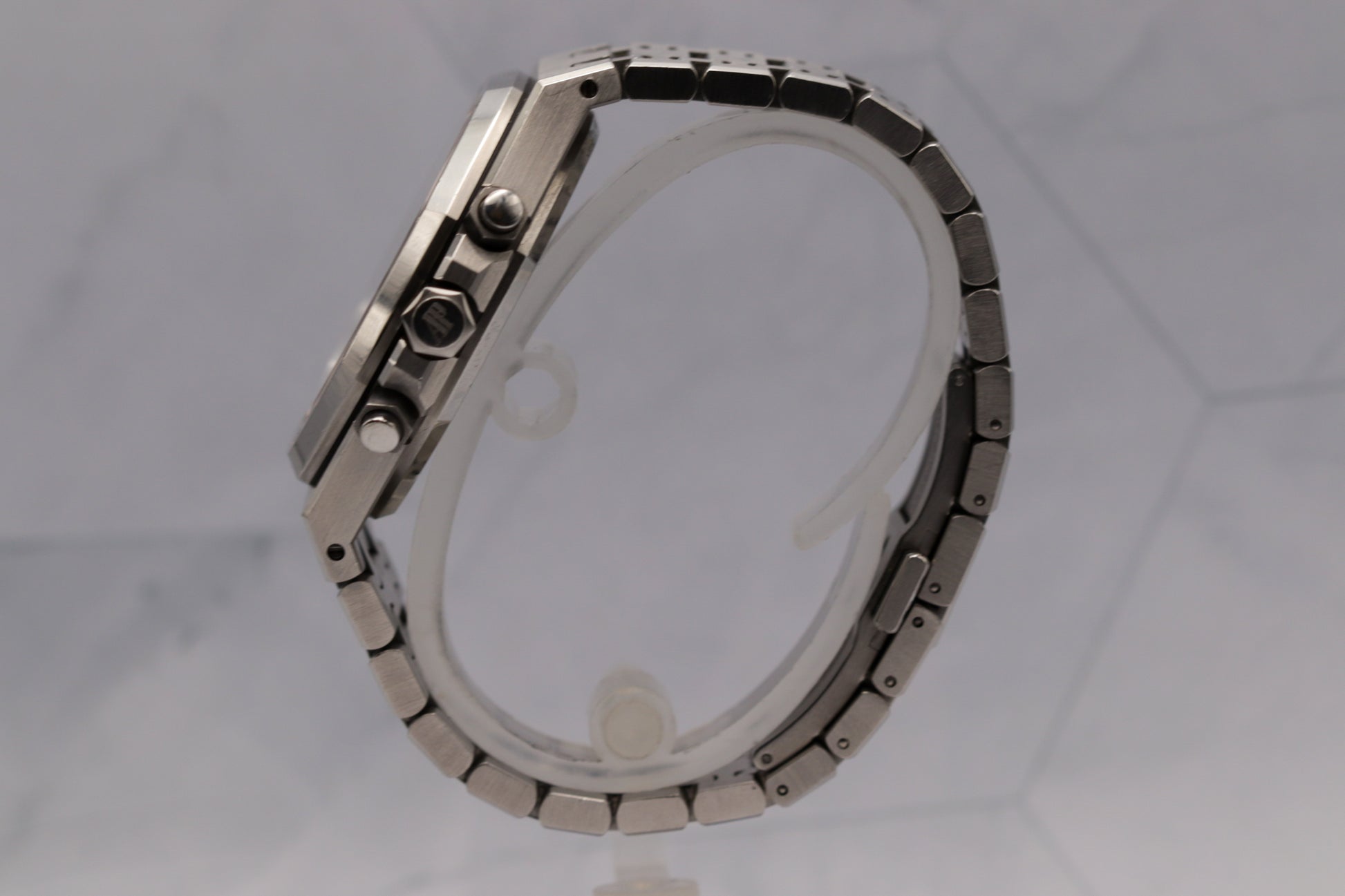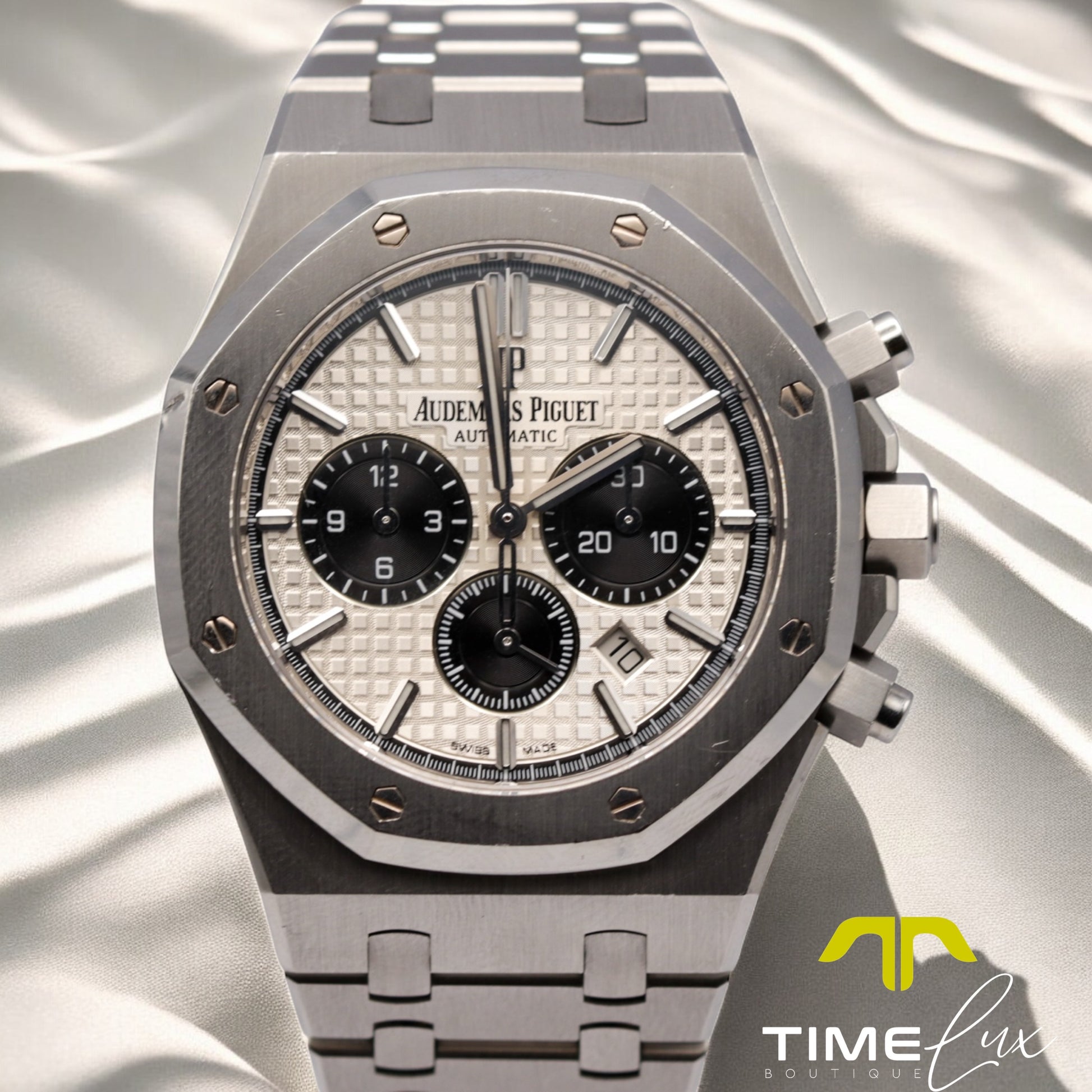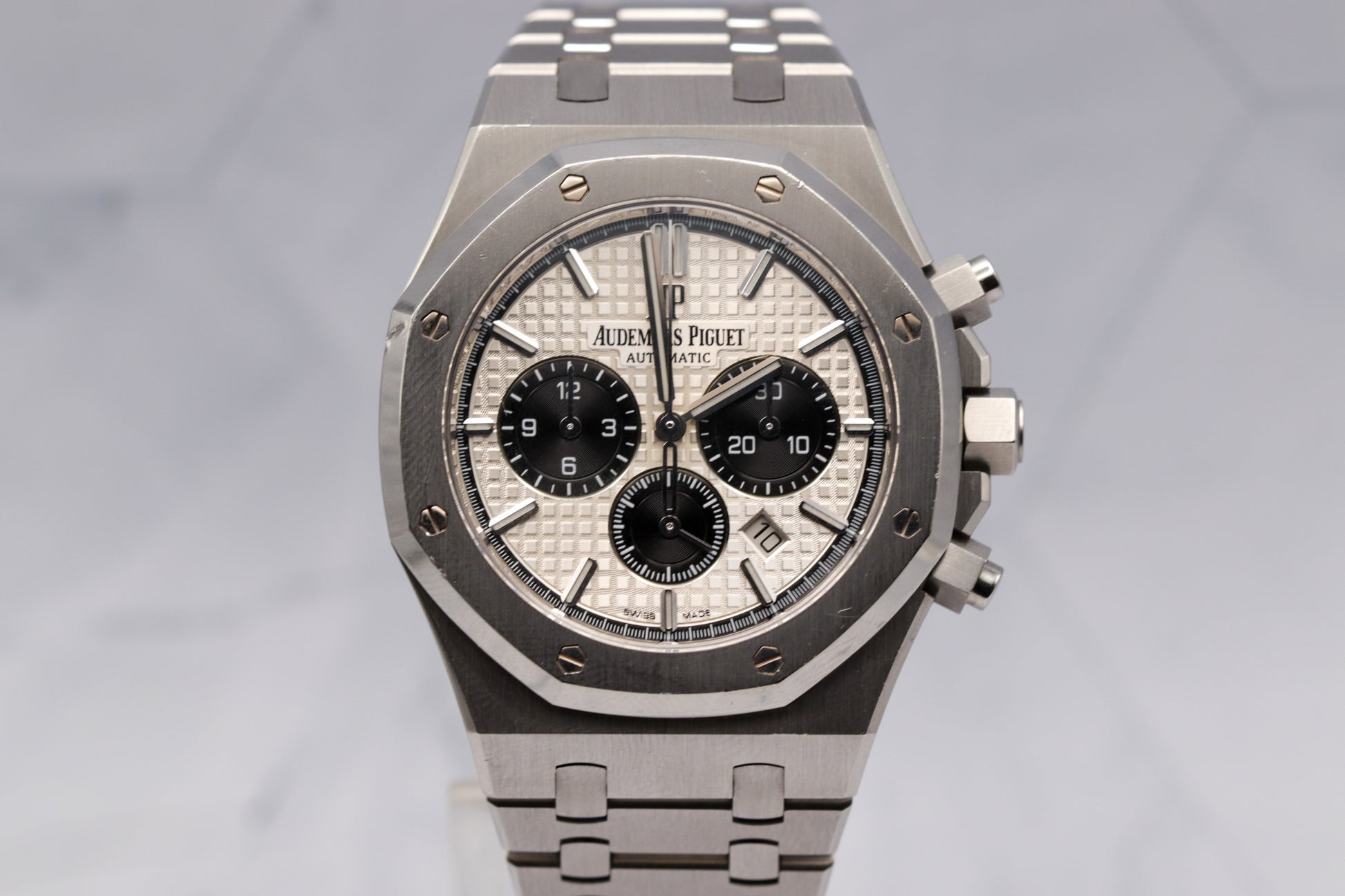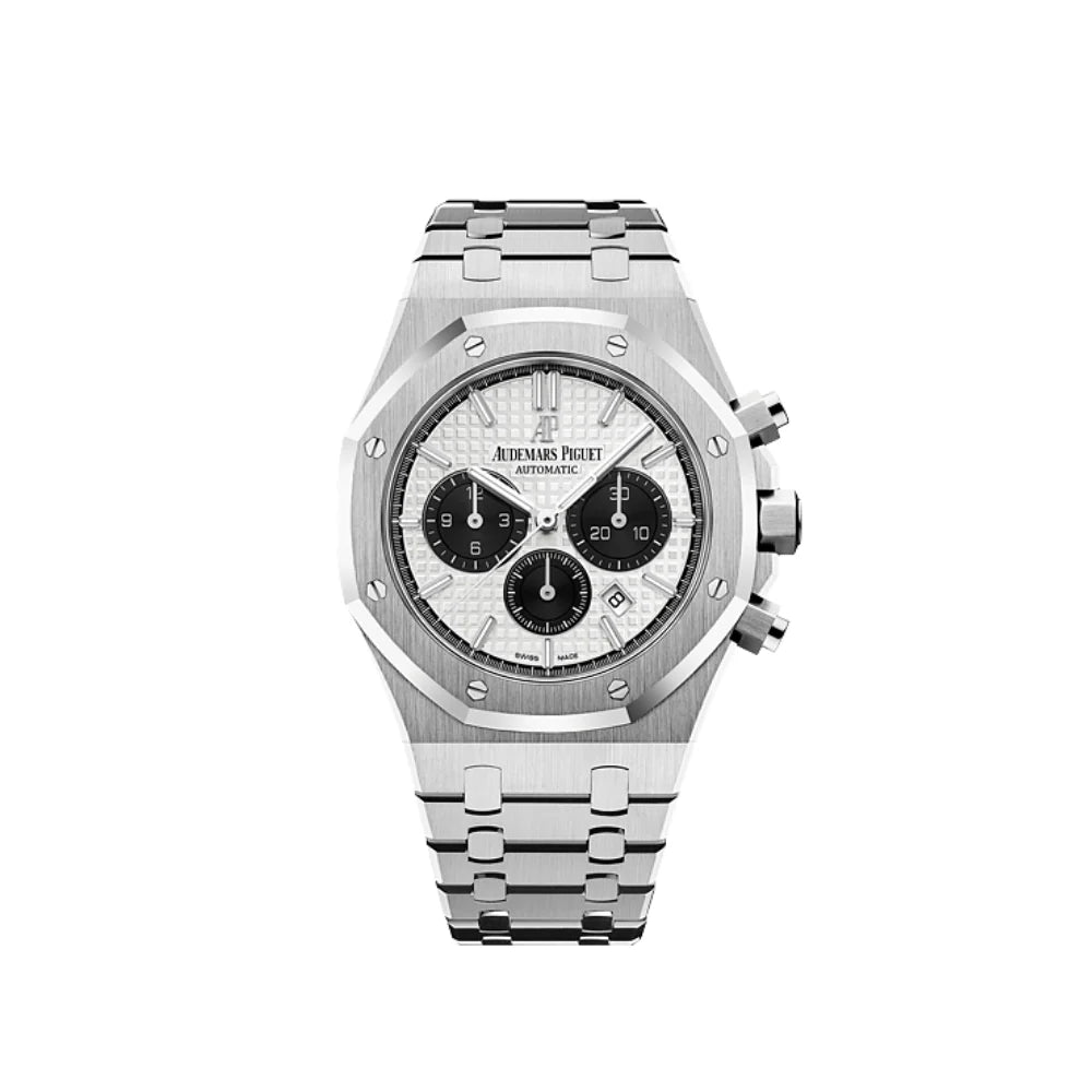 A modern icon. The AP Royal Oak Chronograph ref. 26331ST.OO.1220ST.03 blends bold contrast with classic design. Its striking white “Panda” dial features black sub dials and the signature “Grande Tapisserie” texture, housed in a 41mm stainless steel case with integrated bracelet and flawless finishing throughout.