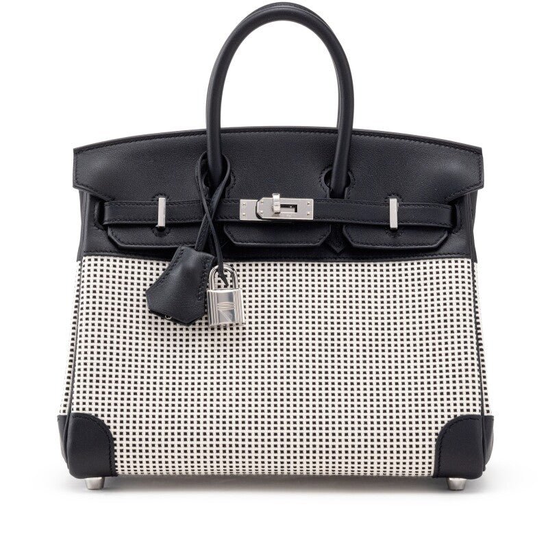 Hermes Black Swift and Ecru Toile Quadrille Birkin 25 Palladium Hardware, 2023