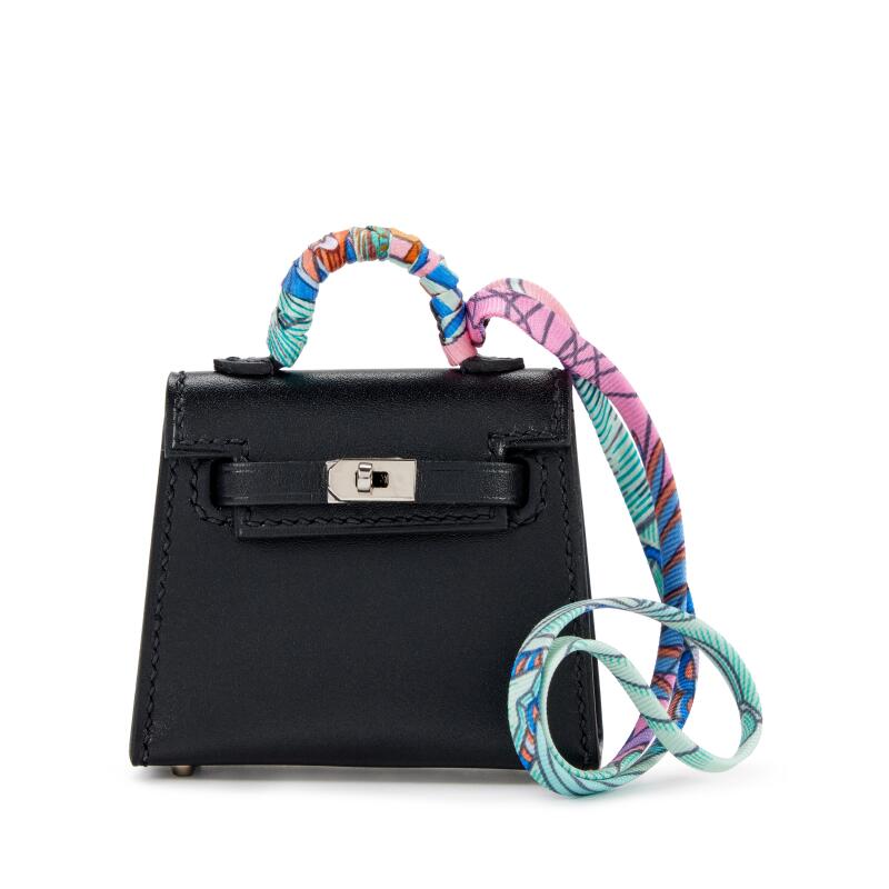 Hermes Black Tadelakt Micro Mini Twilly Kelly Bag Charm Palladium Hardware, 2021