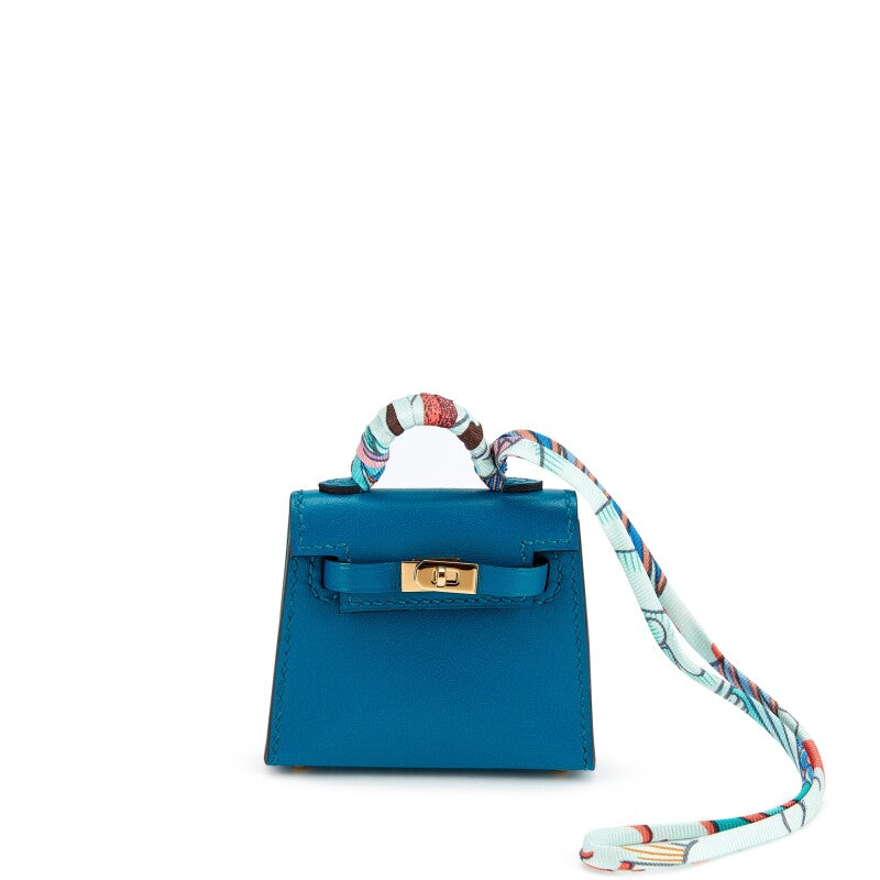 Hermes Bleu Izmir Tadelakt Micro Mini Kelly Twilly Bag Charm Gold Hardware, 2021