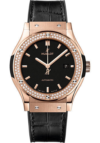 42 mm polished and satin-finished 18k king gold case, polished 18K king gold bezel set with 138 diamonds totaling 1.01cts with, 6 H-shaped titanium screws, sapphire crystal with anti-reflective treatment, matte black dial, HUB1110 self-winding movement, approximately 42 hours of power reserve, black rubber and alligator leather strap, 18K king gold and black pvd stainless steel deployant buckle. Water resistant to 50m (5 ATM).