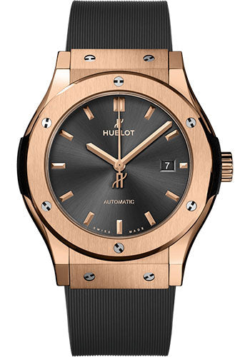 42 mm satin-finished and polished 18k king gold case, satin-finished and polished 18K king gold bezel with 6 h-shaped titanium screws, sapphire crystal with anti-reflective treatment, satin-finished gray sunray dial, HUB1110 self-winding movement, approximately 42 hours of power reserve, gray lined rubber strap, 18K king gold deployant buckle. Water resistant to 50m (5 ATM).